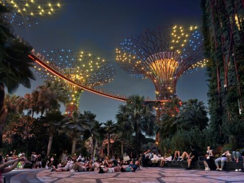 日が暮れるとともに、園内のシンボル「スーパーツリー」が一斉にライトアップされます。
