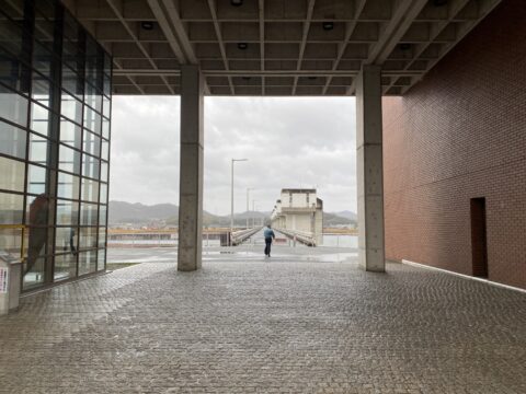 手前のピロティ空間からは、川を渡る管理橋(画面左奥へ続く橋)が見えますが、この管理橋から延長された軸と、管理棟本体が直角に交わるように配置計画がなされています。現場で立つと、その軸線の通りがよく分かります。